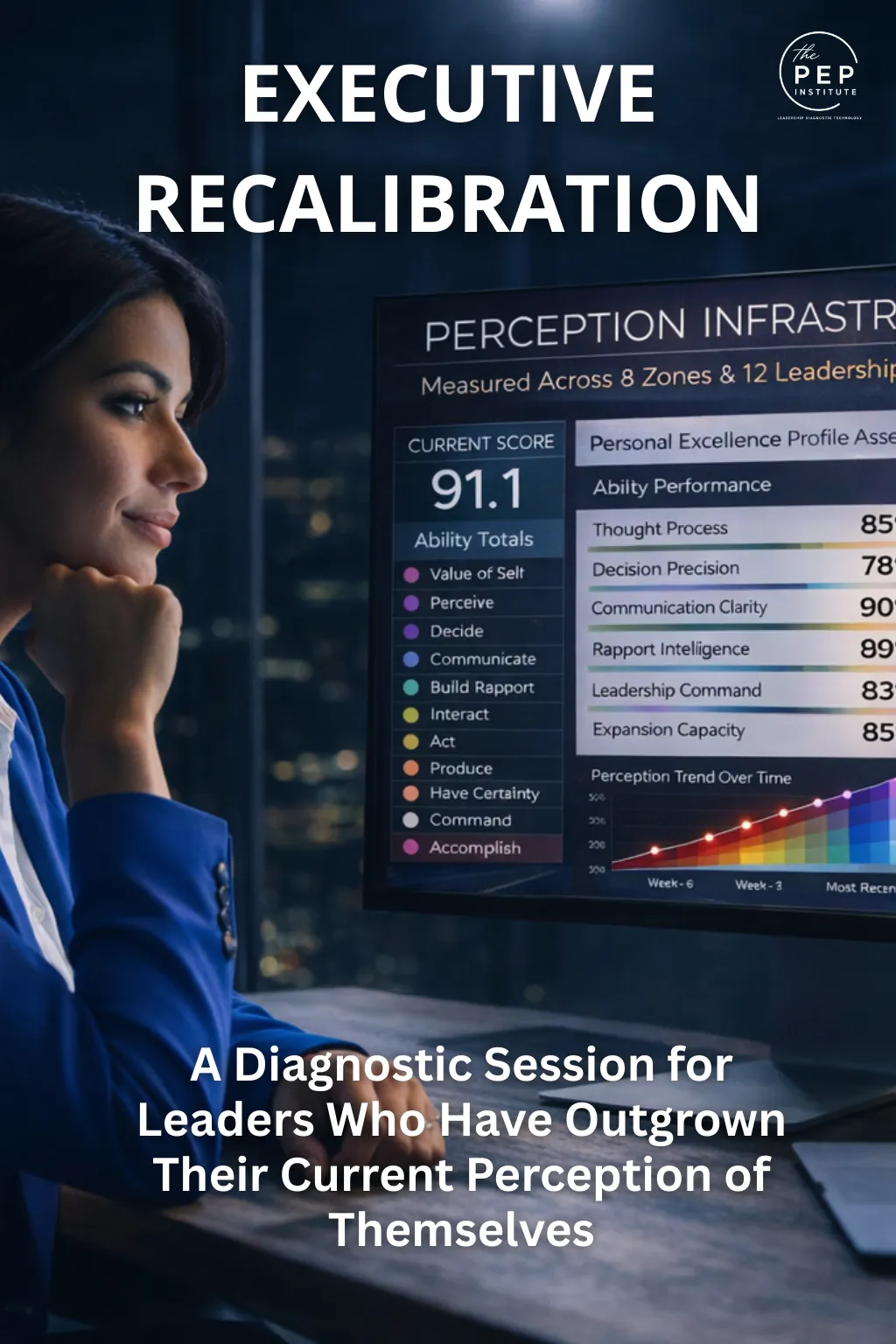 The PEP is a proprietary diagnostic instrument measuring 12 life abilities across 8 identity zones. It is not a personality assessment. It does not type you, rank you, or place you in a category. It maps the current state of your perceptual infrastructure — where your identity is coherent, where it is distorted, and the specific nature of each gap. The results are precise, individualized, and directly applicable to your leadership context.